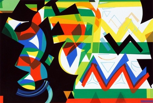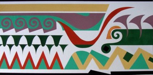 a synthesis of three to four plain colours in formal approaches that include arabesques and twisted shapes. The use of straight lines, linked by curves and counter-curves, repeated in porallel formations and antitheses, suggests the movement of the Deleuzian concept: "the characteristic of the Baroque is the fold that goes on to infinite".